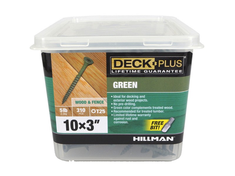 Deck Plus Green Deck Screws were designed to provide superior weather protection all while coordinating with your decking finish. Engineered using star drive technology, these screws are twice as durable as a Philips drive and prevent stripping. The green 4-layer coating provides superior rust and corrosion protection Type 17 point reduces the risk of board splitting & eliminates the need for pre-drilling Flat head leaves a clean, even finish